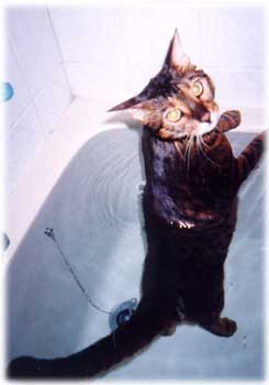 最近のフィガロの入浴シーン!!!お湯の中で毛が膨らんでいます。野太いです。「まだ、入ってても良い?」って顔でしょ?(笑) おまけの写真見てみる? |