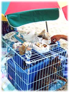 砂浜でのフィガロは、ビーチパラソルの下にケージを組み立てて、クーラーBoxごと入れてあげました。(笑) それをテーブル変わりにお昼ご飯を食べる私たち。砂浜では目立っていました。。。(笑) |