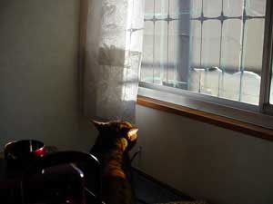 この外猫さんはご近所さんが飼われているにゃんこだそうで、よく窓の外を横切ると母が言っていました。フィガロはキャットショー等以外でよその猫を目にすることが普段ないので、見つけた途端、威嚇しだしました。 |