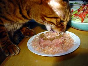 前回、ロウソクの炎でヒゲを焼いていたので(爆)今回はロウソク無しでやりました。フィガロは「何?今日何?なんでこんなに美味しいモノ食べさせてくれるの?」とちょっと戸惑いましたが、すぐに一心不乱に食べ出しました。 |