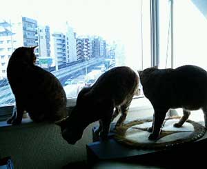 お引越をして、また大きな通り沿いのマンションになりました♪階数が上のほうなので、猫が喜ぶのは、カラスが近くまできた時だけ。それでも、すっかり慣れて楽しく暮らしていますよ♪ |