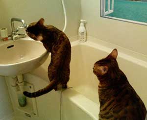 洗面台とバスがいっしょなので、ちょうど、バスタブに乗って、水道からの直飲みをやる猫達。3匹順番待ちして並んでると可愛いのよ。でも、クラウディオがすぐに横入りするの。マナーが悪いコちゃんで、お母ちゃん恥ずかしいったらありゃしない!! |