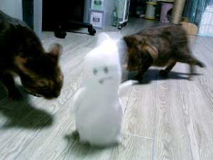 今年のハロウインは可愛いお化けのオモチャを買ってきてあげました♪音楽に合わせて動き回る楽しいヤツなので、猫達もお化けが動き出すと興味津々でした! |