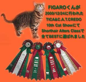 フィガロの結果としてはアルターのショートヘアーでは全てBESTで、オールブリードでは3rdと5thでした。 初めてにしては上出来だったと思います。みなさんにフィガロのグリッターの美しさや手触りの滑らかさを褒めて頂き本当に飼い主冥利につきました。 |