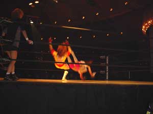| そして、第一試合です。「アップルちゃん達VS X?号達」でした。Xの[分かんない分かんない攻撃]が印象に残りました。(笑)続いて、第2試合です。「チャパリータASARI VS 西尾美香」女子プロシングルマッチは身のこなしが軽く派手な大技が面白かったです。この後はちょっとプロレスは休憩で物真似ショーでした。二人目に出てきてくれた佐藤氏のロボコップは、テレビのモノマネ番組でファンになった思い出のネタでもあったので、生で見れて大感激でした!(笑)そして、プロレスじゃなくて「アクション空手?」のような試合がありました。ヒップホップ系のダンスと空手を足して2で割ったような踊ってるような動きの人とか、なんちゃってブルース・リーのような拳法とか何でもありの試合が大変面白かったです。その後そういえばストリップショーもありましたね。(私は化粧室に行ってて写真がないの。残念?)チップを貰うと円を描くようなご開帳は笑わせて頂きました。(爆) |