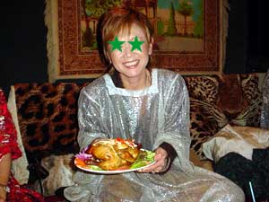 | 食事が始まって間もなく、次々と店長に選んで貰った中近東の民族衣装を着せられました。(笑)みんなゴージャスになって面白かったです!それから、店長からお誕生日様はキレイなトルコのグラスをプレゼントされてました♪食べても食べても無くなった気がしない、次から次に出てくる料理を一生懸命食べていたら。。。お店からのお誕生日プレゼントがやってきました。。。「鶏の丸焼き(一羽丸ごと)」(爆)思ってもいないプレゼントに、腰が抜けました。(笑)これはここで食べないでお持ち帰り出来て良かったです。 |